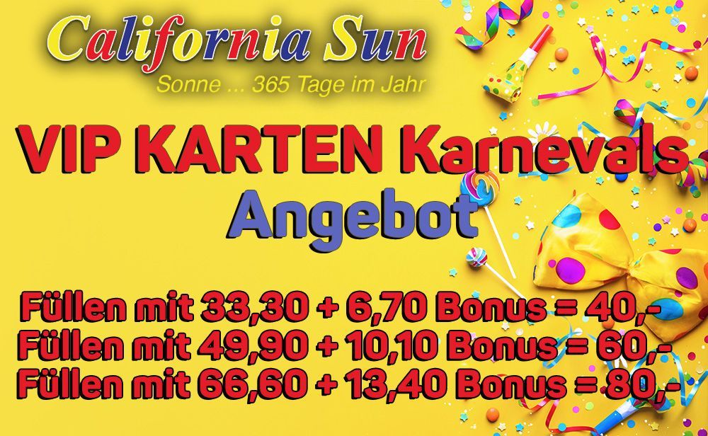 wir haben ein mega VIP-Karten-Angebot zum 44-jährigen Jubiläum von California Sun für Euch! Seit 44 Jahren sind wir euer Top-Partner für perfekte Bräune. Sichert euch euren Bonus beim Aufladen!